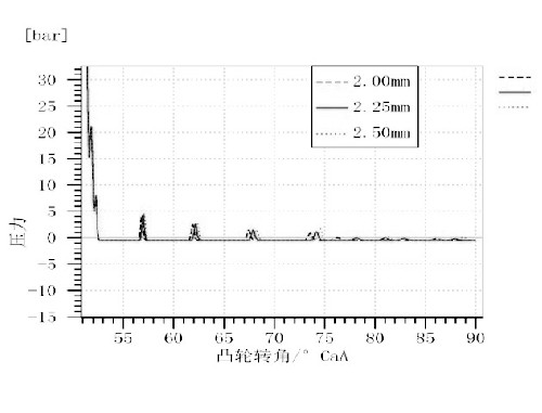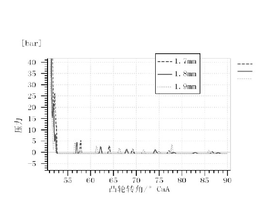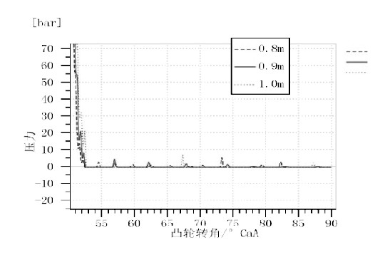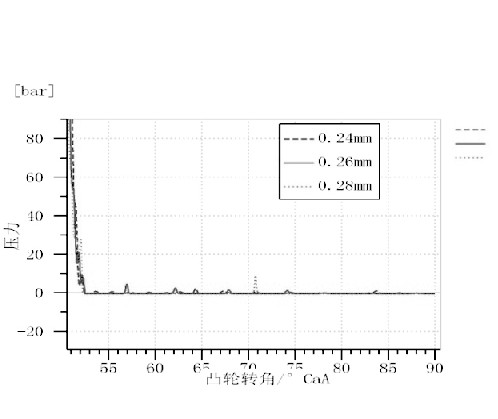 實驗時基本參數為, 凸輪軸轉速為500r/min, 高壓油管長度0.9m, 油管厚度為2.25mm, 油管直徑1.8mm, 噴孔直徑為0.26mm。首先改變油管長度, 對比參數為0.8m和1m, 如圖1所示, 隨著管路長度的增大, 殘余壓力波動的波峰明顯增大, 但波長相對較小, 這也決定了管路不能做的太長, 容易導致噴油器的二次噴射;也不能太短, 會造成燃油噴射不穩定。其次, 改變高壓油管的厚度, 對比參數為2mm和2.5mm, 如圖2所示, 由此可發現, 隨著高壓油管厚度的增加, 殘余壓力波的峰值并未改變, 相位延遲, 波長變長, 殘余壓力的衰減也越快;再改變高壓油管的直徑, 對比參數為1.7mm和1.9mm, 實驗發現, 隨著高壓油管直徑的增加, 波長變短, 波峰下降, 但是存在不規律波動, 孔徑也不能太小, 否則會使脈動增加, 這是由于隨著孔徑的減小, 產生節流作用;最后, 改變對噴油特性有顯著影響的噴油嘴的噴孔直徑, 對比參數為0.28mm和0.24mm, 如圖3、4, 通過實驗對比發現, 隨著噴孔直徑的變化, 殘余壓力也會產生相應變化[3], 噴孔孔徑增加, 殘余壓力波長變小, 但峰值卻相應的增加, 會導致不正常噴射[4], 同時這也是燃油霧化不良的主要因素, 但噴孔直徑過小, 會導致壓力波在管內往復傳播的頻率增加, 導致管路不穩定, 脈動加劇。