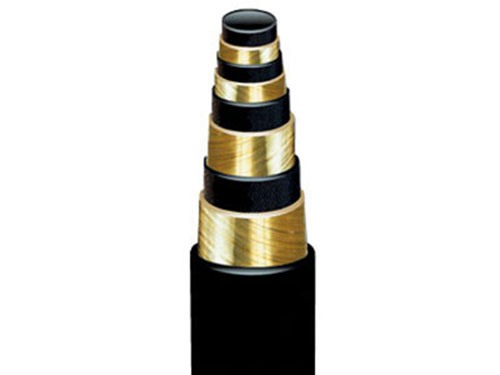 一、高壓鋼絲纏繞膠管產品結構:主要由內膠層、中膠層、2、4、6層鋼絲纏繞層、外膠層組成。內膠層具有使輸送介質承受壓力,保護鋼絲不受侵蝕的作用,外膠層保護鋼絲不受損傷,鋼絲(ф0.3-2.0增強層)層是骨架材料起增強作用。